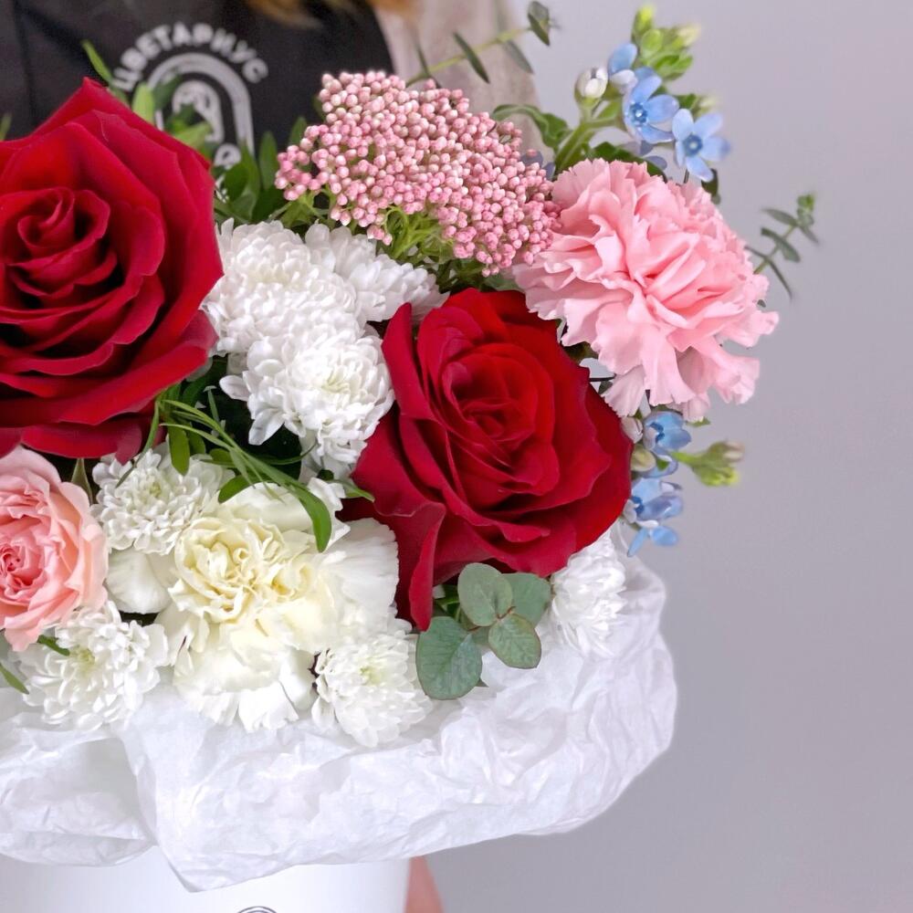 Озотамнус – 1 шт.Кустовая роза – 1 шт.Зелень – 1 шт.Гвоздика – 3 шт.Шляпная коробка – 1 шт.Твидия – 2 шт.красные розы – 2 шт.байкал хризантема – 1 шт.