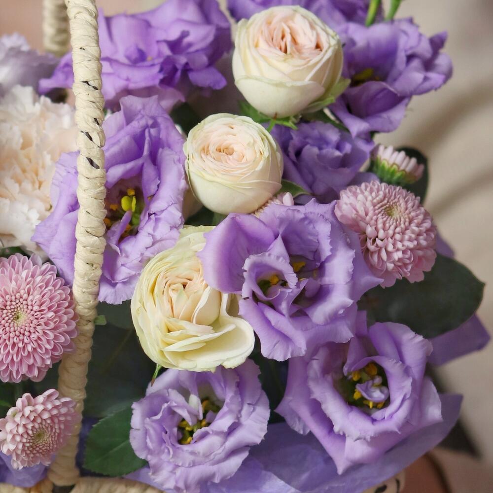 Сиреневая композиция в корзине с розами и эустомой