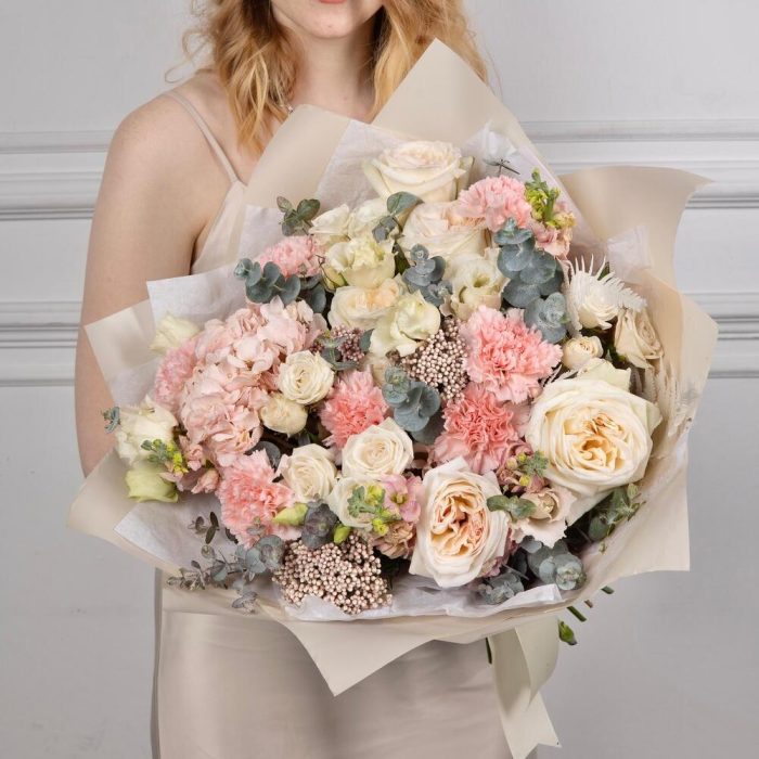 Гортензия – 1 шт.Эвкалипт – 5 шт.Маттиола – 7 шт.Эустома – 4 шт.Озотамнус – 3 шт.Диантус – 7 шт.Кустовая пионовидная роза – 5 шт.white o’hara – 5 шт.Упаковка дизайнерская – 2 шт.Писташ – 1 шт.Папоротник – 3 шт.