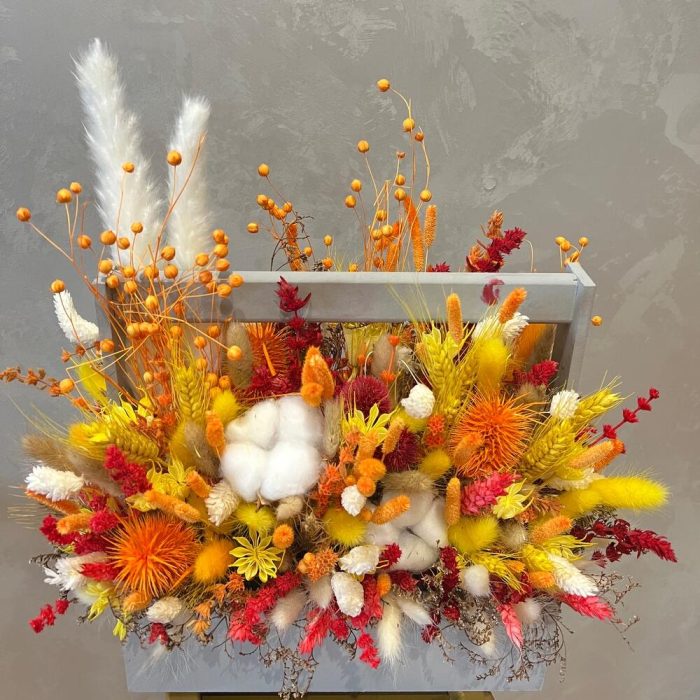 Тростник – 2 шт.Лагурус – 200 гр.Флум – 50 гр.Хлопок – 5 шт.Роза стабилизированная – 2 шт.Пшеница (сухоцвет) – 100 шт.лен сухоцвет – 30 гр.Лимониум – 50 гр.
