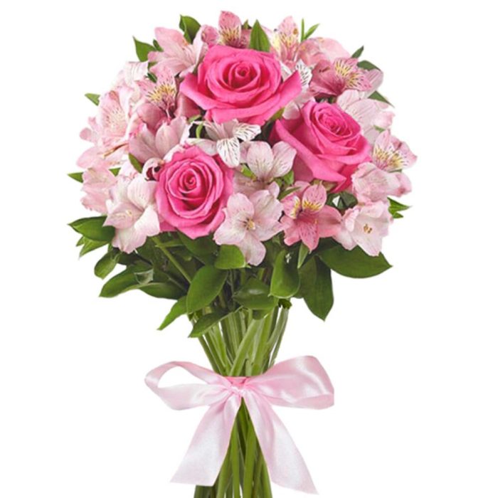 лента атласная (розовый) – 1 шт.альстромерия (белый) – 2 шт.альстромерия (розовый) – 3 шт.роза одноголовая розовый – 3 шт.