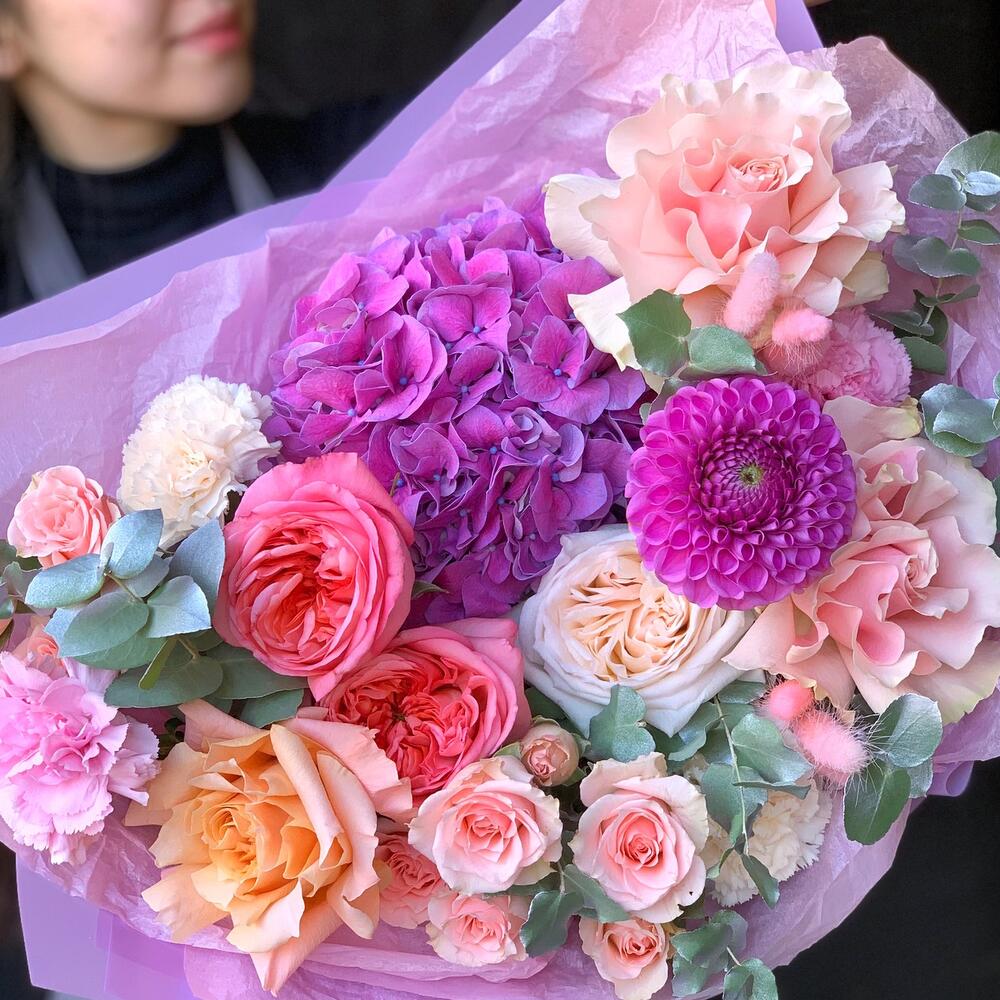 Гвоздики, Кустовые розы, Пионовидные розы, Розы