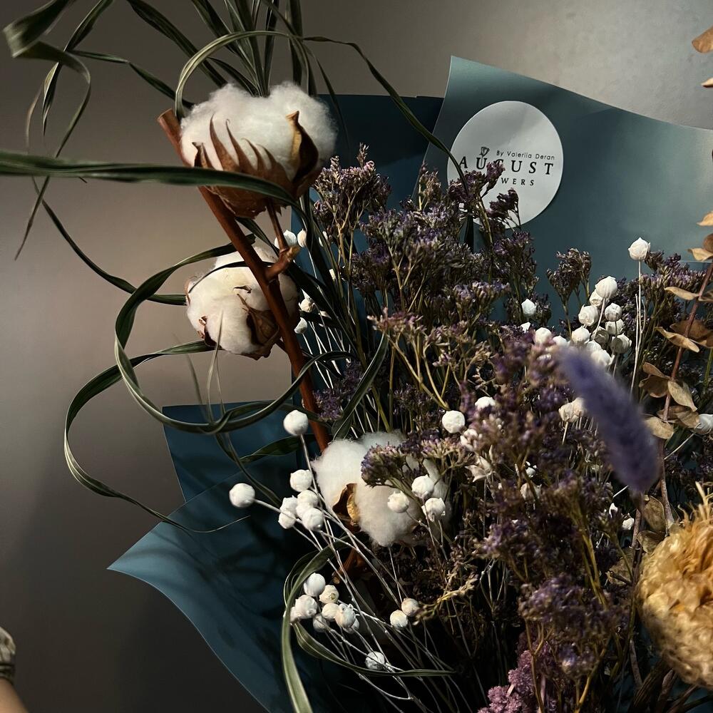 Хлопок ветка – 1 шт.амарант сухоцвет – 1 шт.Лагурус (сухоцвет) – 11 шт.Эвкалипт сухоцвет – 5 шт.пальма сухоцвет – 1 шт.лен сухоцвет – 5 шт.лимониум сухоцвет – 5 шт.артишок сухоцвет – 1 шт.Пленка матовая – 3 шт.Лента атласная – 1 шт.