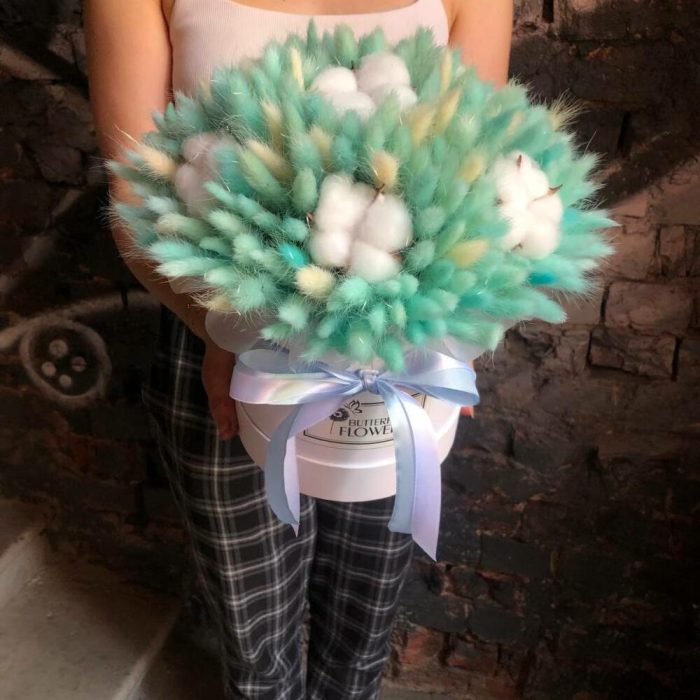 Букет из сухоцветов – лагуруса и хлопка в шляпной коробке «Прикосновение»