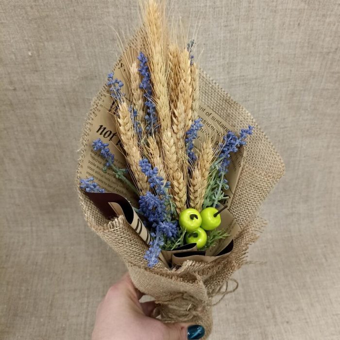 Искусственная лаванда – 1 шт.Пшеница (сухоцвет) – 10 шт.яблоко декоративное – 3 шт.Авторская упаковка – 1 шт.Мешковина – 1 шт.бечевка натуральная – 1 шт.