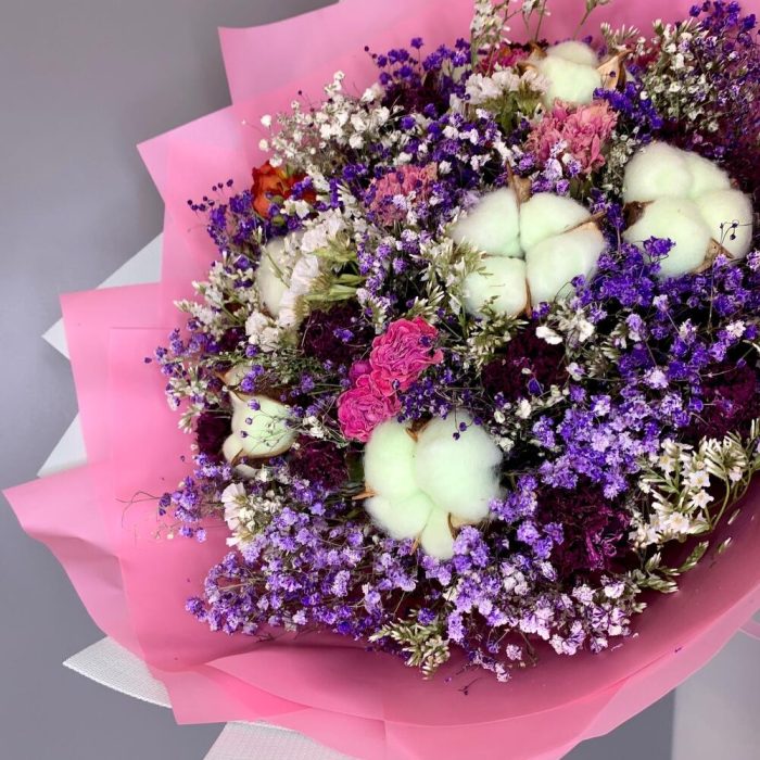 Букет из сухоцветов в лавандовых оттенках с хлопком