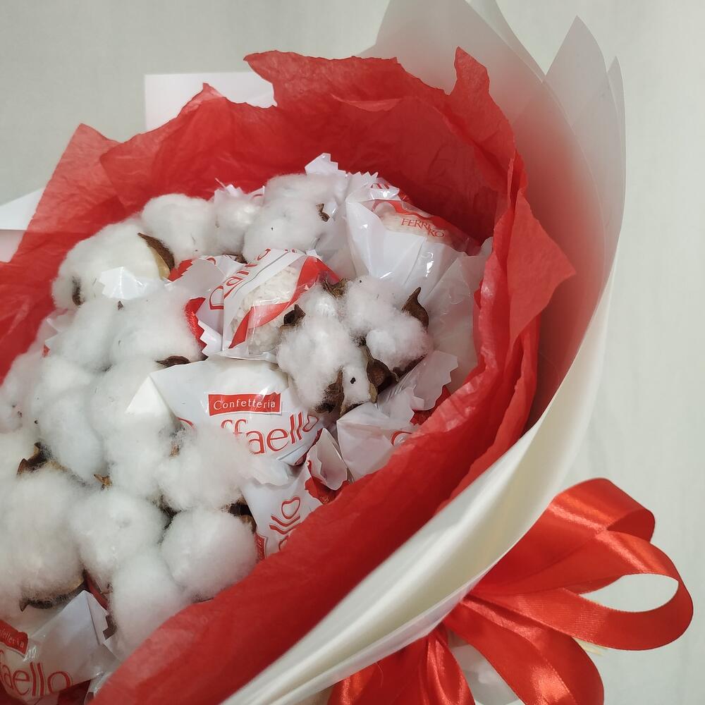 Raffaello конфеты – 19 шт.Хлопок – 8 шт.Тишью – 1 шт.Бумага – 1 шт.Лента – 1 шт.