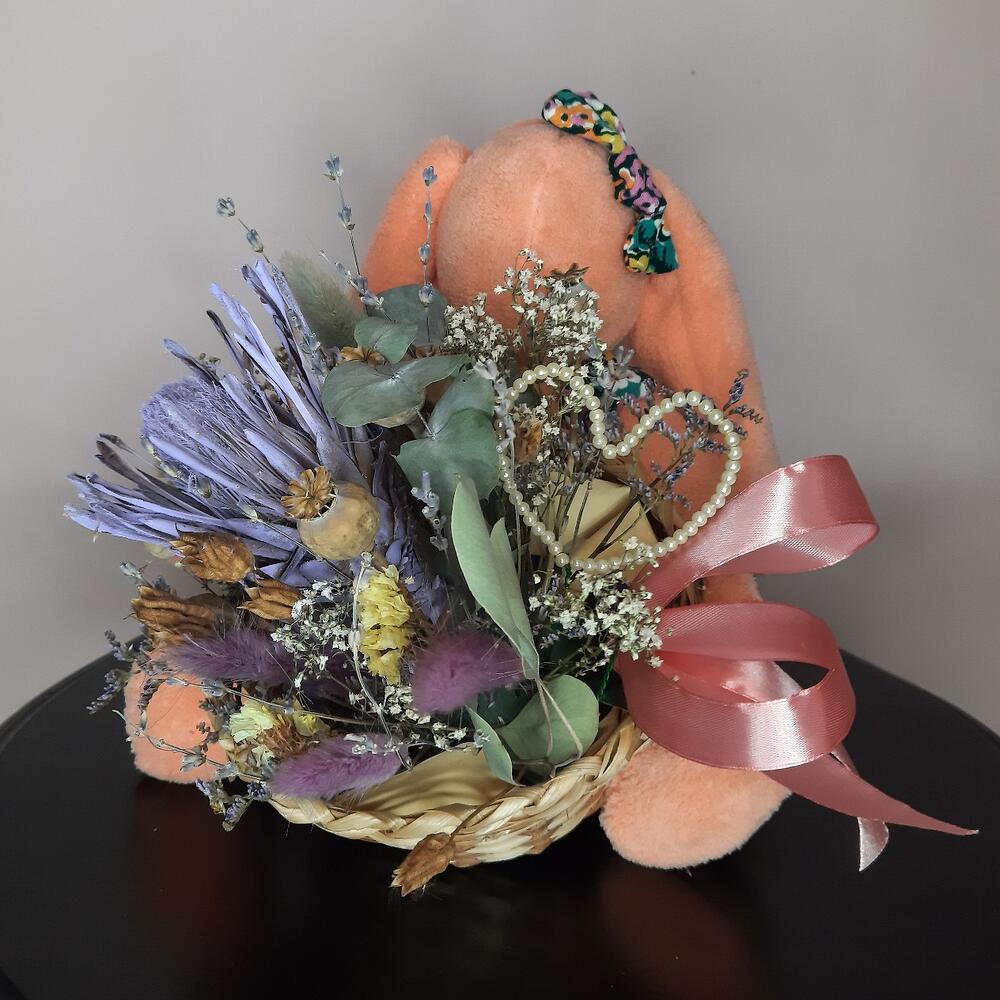 Гипсофила – 2 шт.Лаванда (сухоцвет) – 10 шт.Протея – 1 шт.Статица – 1 шт.Корзина плетеная – 1 шт.Игрушка ручной работы – 1 шт.