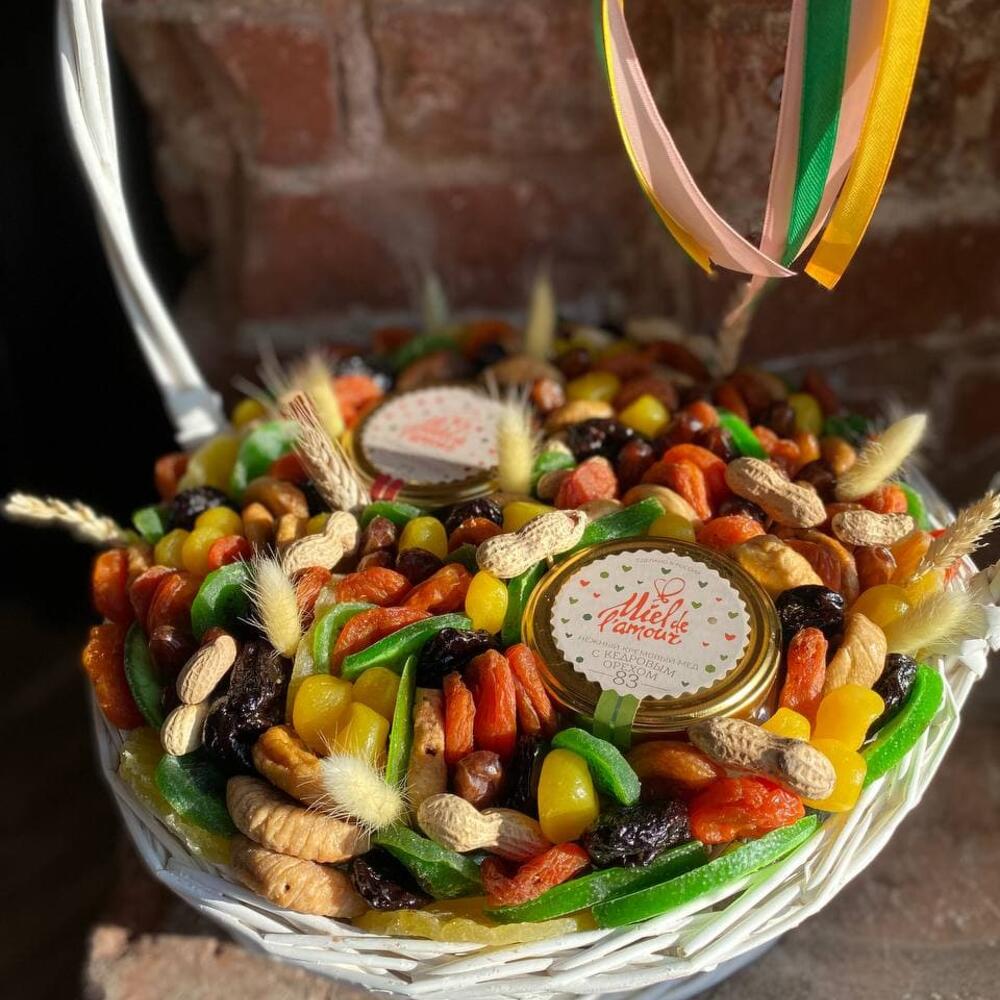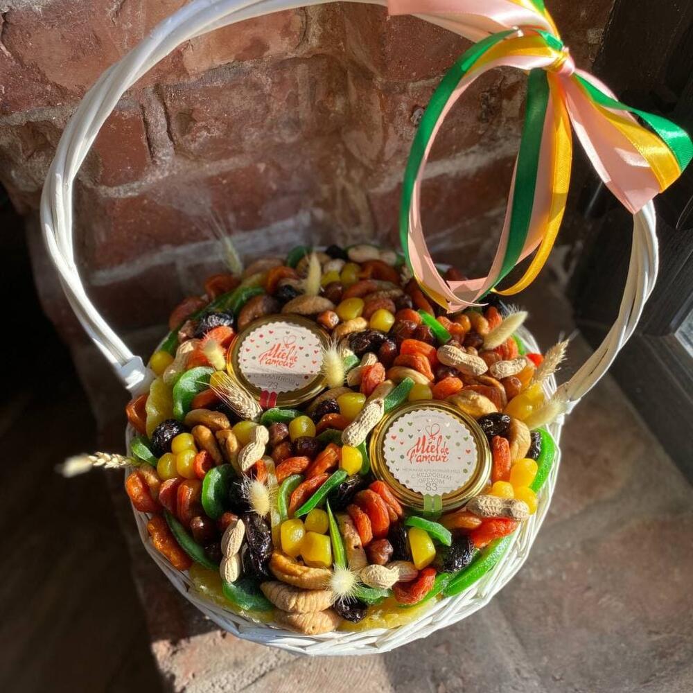 Корзина с орехами, сухофруктами и мёдом “Первые ростки”