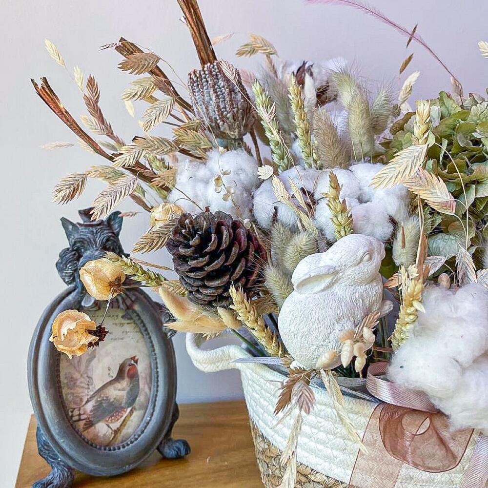 Гортензия – 1 шт.Хлопок натуральный – 7 шт.Физалис – 1 шт.Лагурус – 25 шт.Банксия – 1 шт.Пшеница – 20 шт.