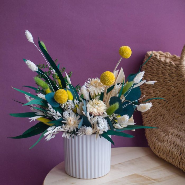 Краспедия желтая – 3 шт.Эвкалипт стабилизированный – 15 шт.Бессмертник – 3 шт.Лагурус – 9 шт.фаларис сухоцвет – 7 шт.озотамнус стабилизированный – 9 шт.