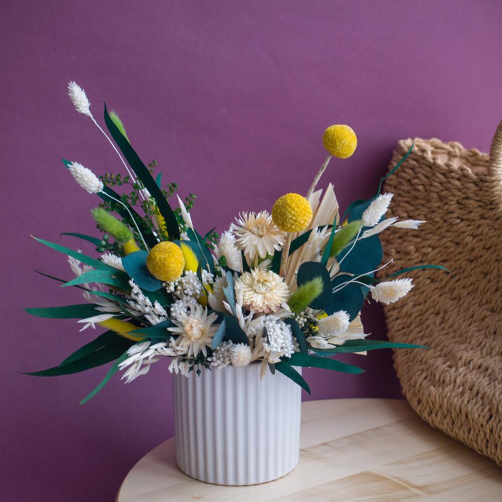 Летняя композиция из сухоцветов и стабилизированных цветов
