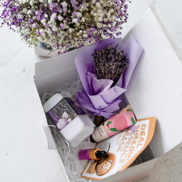 Очаровательный подарочный набор.В составе : маска для лица корейская, масло для кутикулы, цветочная композиция, букет лаванды , крем для рук, набор бомбочек для ванны, подарочная коробка