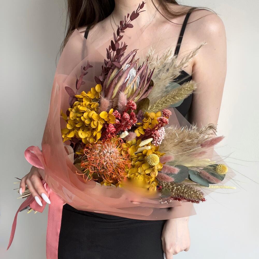 Гортензия – 1 шт.Озотамнус – 1 шт.Протея – 1 шт.Эвкалипт – 3 шт.Нутан – 1 шт.Капс – 1 шт.Упаковка дизайнерская – 1 шт.Ковыль – 2 шт.Лагурус – 9 шт.Сетария – 2 шт.Флум – 9 шт.пампас – 1 шт.