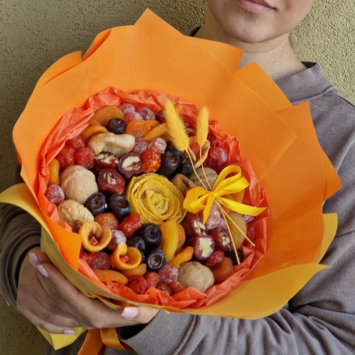 манго вяленое – 70 гр.Финики – 100 гр.кумкват в сахарной пудре – 80 гр.кизил – 80 гр.курага турецкая – 105 гр.курага бобон – 50 гр.Инжир – 50 гр.персик вяленый – 30 гр.Грецкий орех – 60 гр.чурчхела – 100 гр.Папайя – 5 гр.Лагурус (сухоцвет) – 2 шт.