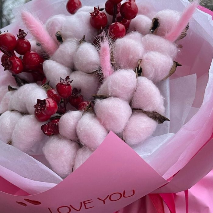 Пленка матовая – 4 шт.Хлопок натуральный – 11 шт.Тишью белое – 4 шт.Лагурус (сухоцвет) – 3 шт.наклейка с пожеланием – 1 шт.ветки декор с глитером – 3 шт.