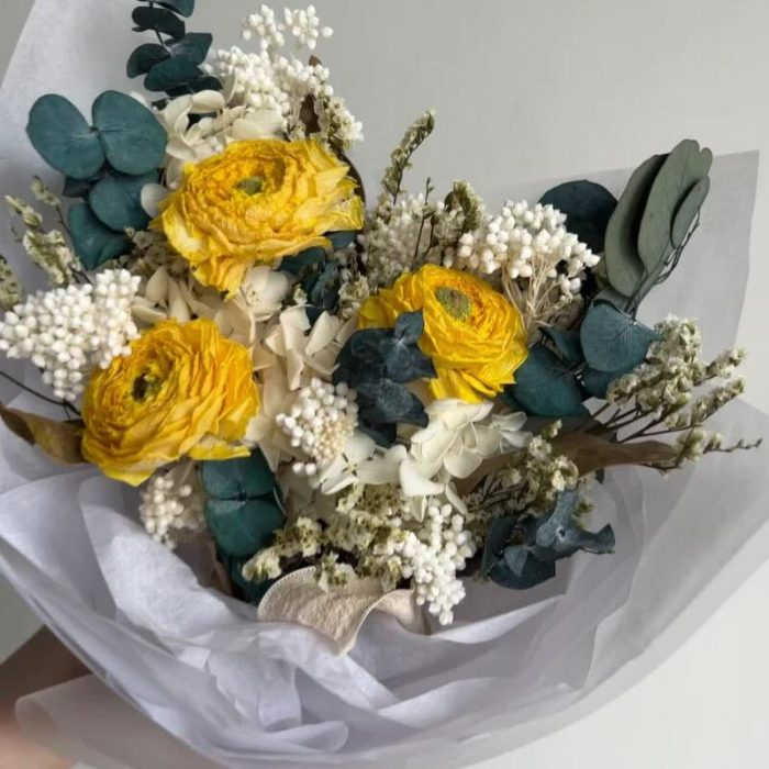 Лимониум – 2 шт.Озотамнус – 2 шт.Эвкалипт – 4 шт.Упаковка дизайнерская – 1 шт.листья протеи – 3 шт.ранункулюс сухоцвет – 3 шт.