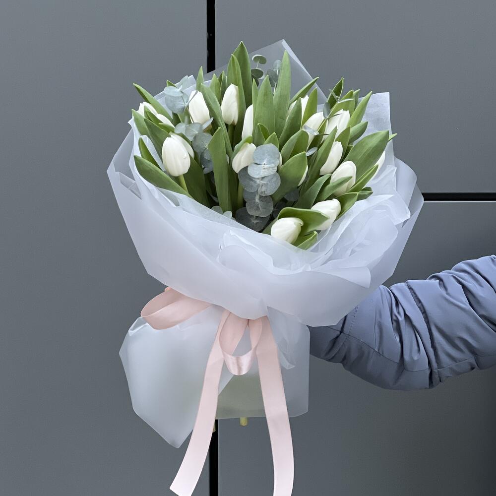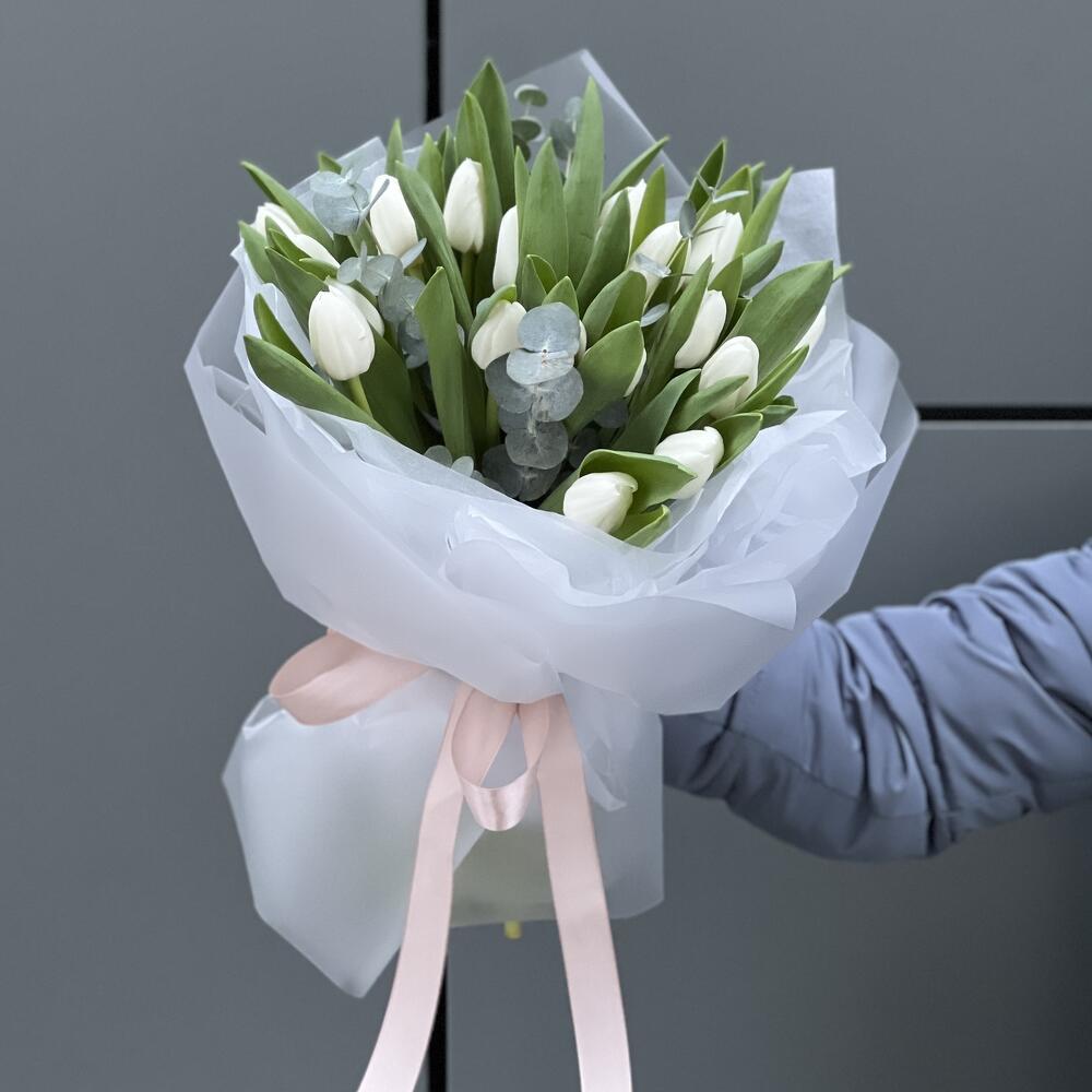 Тюльпан белый – 19 шт. Эвкалипт – 2 шт. Оформление – 1 шт.