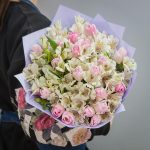 Букет из розовых роз, альстромерии и зелени «Матильда»
