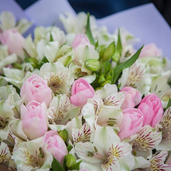 Букет из розовых тюльпанов и белых альстромерий