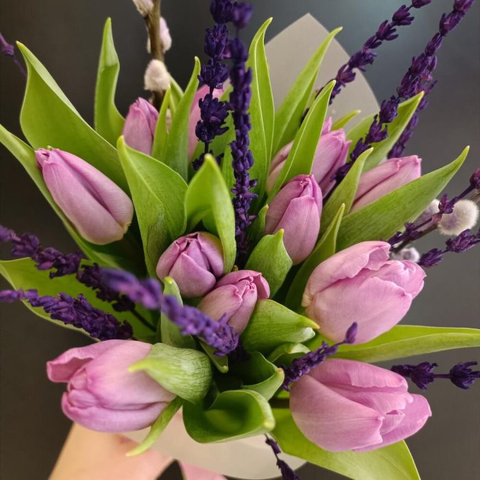 Тюльпан – 11 шт.лаванда стабилизированная пучок – 1 шт.Упаковка – 1 шт.Лента – 1 шт.транспортировочная упаковка – 1 шт.