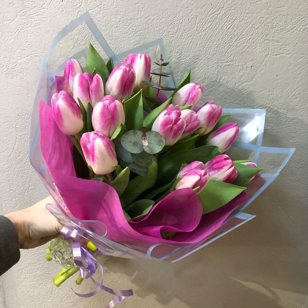 тюльпаны – 18 шт.Эвкалипт – 1 шт.Пленка матовая – 1 шт.